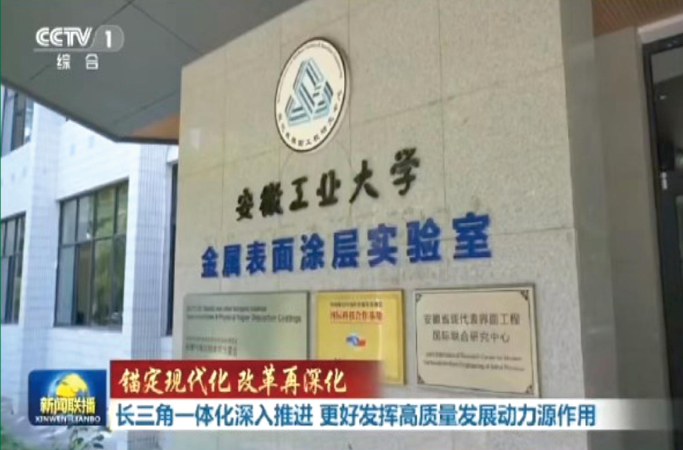 2024年8月26日晚,中央广播电视总台《新闻联播》报道了安徽工业大学金属表面涂层实验室服务行业重大科技需求深度参与长三角协同创新的情况。报道以《长三角一体化深入推进 更好发挥高质量发展动力》为题,在专栏《锚定现代化改革再深化》专栏播出。报道提到,在安徽工业大学的金属表面涂层实验室,一个由上海、江苏、安徽的行业龙头企业,与长三角国家技术创新中心联合发起的钛合金材料“众筹科研”项目正在进行。