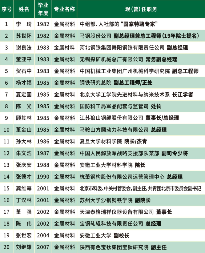 多名校友已成长为企业、高校的中高层领导,毕业生包括中国机械工业集团广州机械科学研究院副总工程师、北京市科学技术委员会副主任、钢铁研究总院结构材料研究所所长、宝武集团宝钢轧辊总经理、安徽工业大学副校长、苏州大学55足球直播