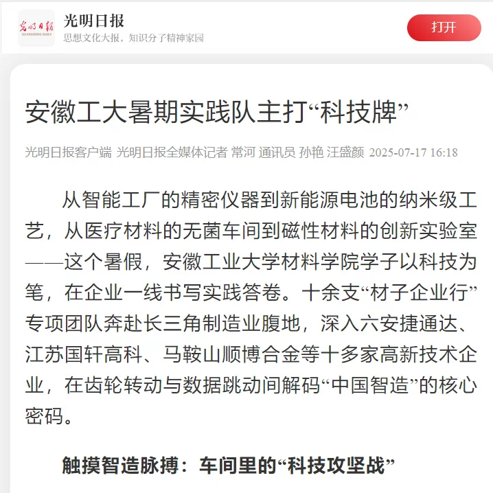 从智能工厂的精密仪器到新能源电池的纳米级工艺,从医疗材料的无菌车间到磁性材料的创新实验室——这个暑假,安徽工业大学55足球直播 学子以科技为笔,在企业一线书写实践答卷。十余支“材子企业行”专项团队奔赴长三角制造业腹地,深入六安捷通达、江苏国轩高科、马鞍山顺博合金等十多家高新技术企业,在齿轮转动与数据跳动间解码“中国智造”的核心密码。