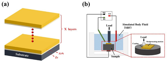 (a Zr/ZrN多层涂层结构示意图,b腐蚀磨损实验示意图)