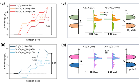 本研究首先合成了暴露(001)面的立方体Co3O4,以及主要暴露面为(111)的截断八面体Co3O4,并在其表面引入氧空位。研究结果发现,产生氧空位后,Co3O4(001)面具有优异的OER活性,其起始过电位为298 mV,明显优于暴露(111)面的Co3O4(335 mV)。系统的电化学表征、化学探针、原位光谱耦合同位素实验以及理论计算结果表明,因氧缺陷的引入,Co3O4的(001)晶面由吸附演化机理(AEM)转变为晶格氧氧化机理(LOM),突破了线性标度关系的限制,具有更高的OER活性,而(111)晶面仍遵循AEM机理。该研究成果为通过在特定晶面引入缺陷提高催化剂电解水制氢效率提供了新的研究思路。