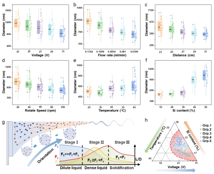 工作系统地研究了电压、流速、硅含量等参数对纤维细度的影响,揭示了溶剂蒸发、聚合物黏度与静电拉伸力的动态平衡机制,实现了高长径比纤维的稳定制备。