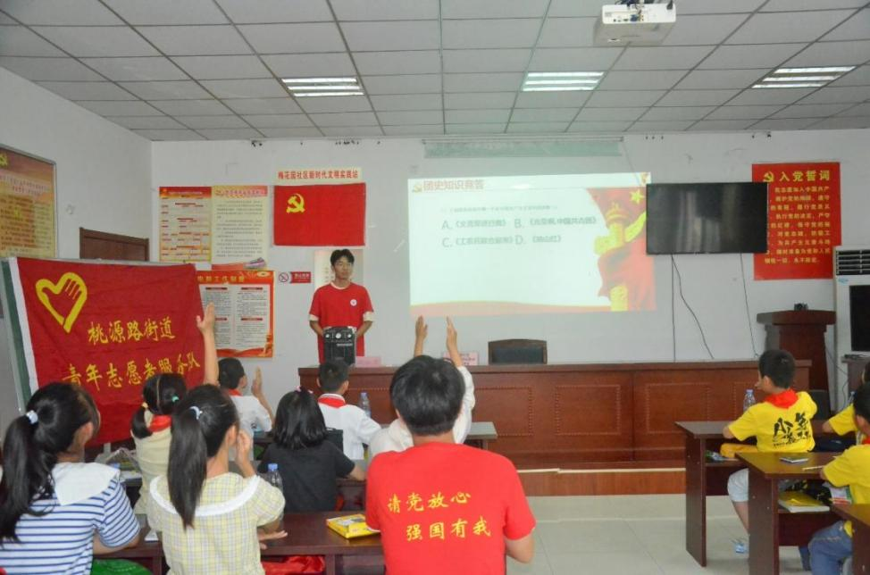 在桃源街道的各个社区,实践团队开展了“百年团史·青年说”宣讲活动,活动中,实践队员以理论宣讲、团史故事、知识问答的形式从团的基本知识、发展阶段、历史事件等方面向小朋友们讲述了百年以来共青团奋斗的光辉历程。队伍还开展“‘童’心协力,护航成长”安全教育活动,实践队通过安全知识宣讲、视频展示、现场情景模拟等方式,从用电安全、交通安全、心理健康安全和防溺水安全教育等方面开展主题教育。在马鞍山市图书馆实践队成员为小朋友们开展了精心设计生动有趣的宣讲绘画课,解读了中华人民共和国国旗、共产党党旗、共青团团旗、少先队队旗的由来及含义,小朋友们还用绘画的方式展现对未来中国梦的愿景,执笔绘梦表达了对入队、入团、对党的美好期望。