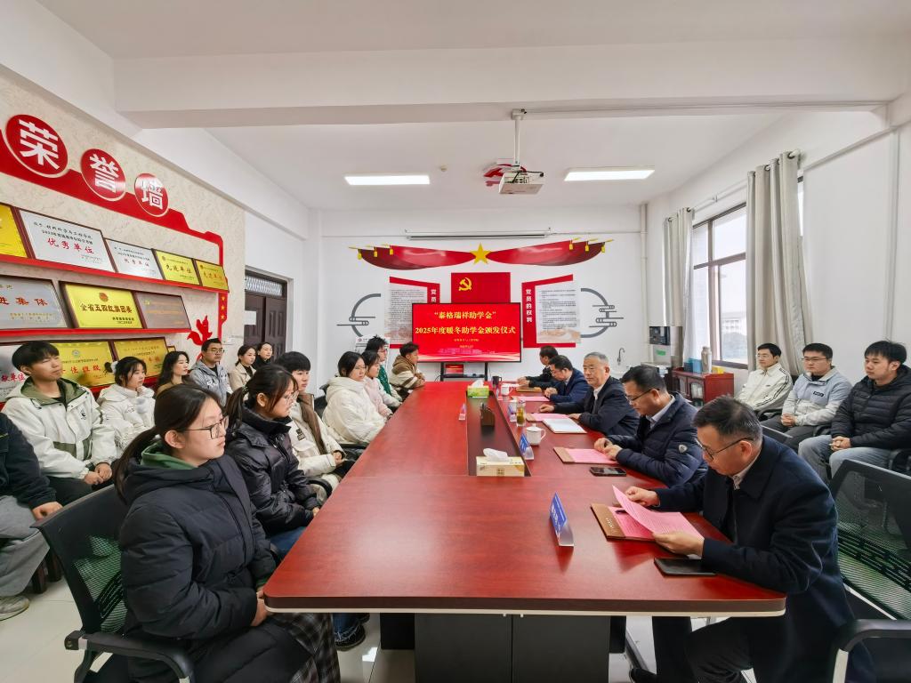 会上通报了《安徽工业大学“泰格瑞祥助学金”2025年度暖冬助学金的评审情况》,介绍了本年度助学金的申请、评审及受助学生基本情况。闵凡飞、董强等共同为受助学生颁发证书。